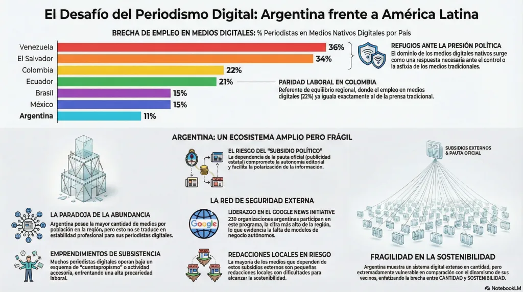 En Argentina, en tanto, este sector sólo emplea al 11% de los profesionales, evidenciando una resistencia de las estructuras tradicionales. El escenario configura un modelo de periodismo «cuentapropista», donde el trabajador suele hacerse cargo de sus propios recursos y de la producción integral de sus espacios.
